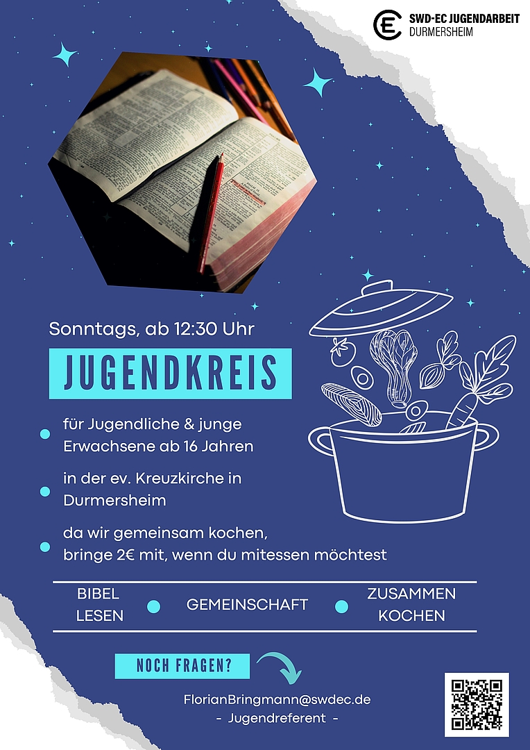 Wir starten mit dem gemeinsamen Kochen (bring dafür einfach 2 € mit, wenn du mitessen möchtest) und nehmen uns anschließend Zeit, um in der Bibel zu lesen, miteinander ins Gespräch zu kommen und über Themen nachzudenken, die uns im Alltag beschäftigen.