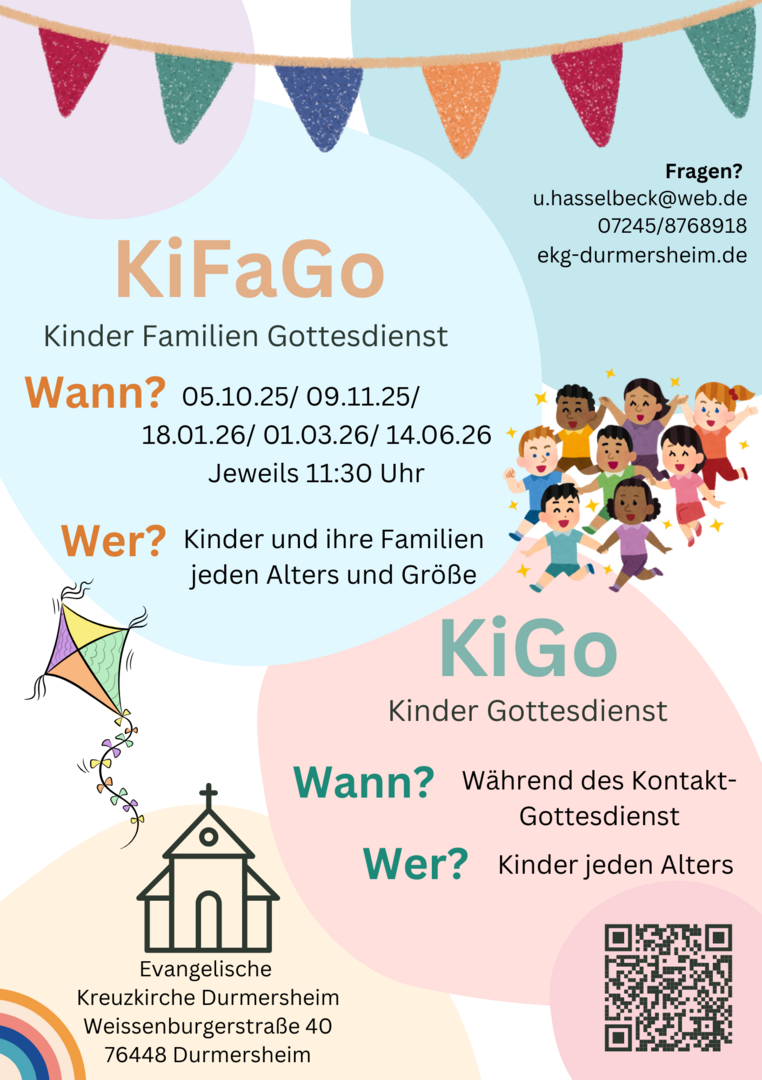 Beim Kinder- und Familiengottesdienst (KiFaGo) feiern Kinder zusammen mit ihren Familien einen lebendigen Gottesdienst mit Geschichten, Liedern und kreativen Aktionen. An ausgewählten Sonntagen um 11:30 Uhr, also nach dem regulären Gottesdienst, gestalten wir Geschichten, Lieder und Aktionen für groß und klein. Die genauen Termine und weitere Infos stehen auf dem Flyer.